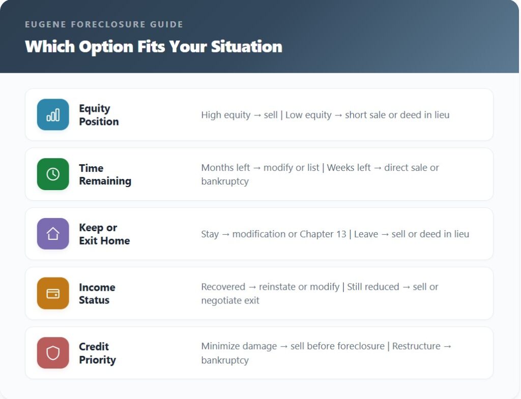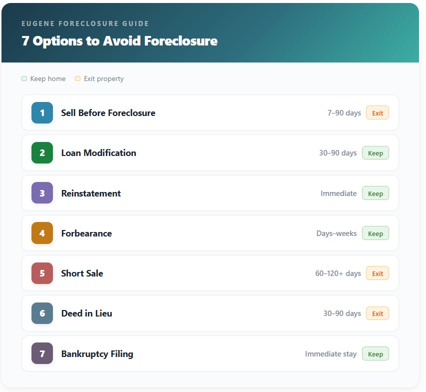 Eugene homeowners facing foreclosure generally have several options, ranging from keeping the home to selling it or negotiating a resolution with the lender. Below is an overview of the most common paths, presented from those that tend to resolve fastest to those that take longer or involve more complexity.