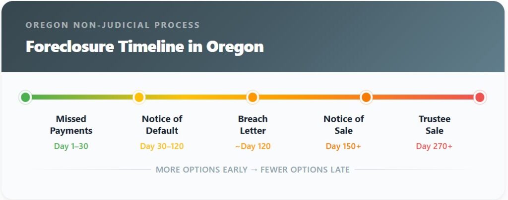Foreclosure pressure typically begins when a homeowner falls behind on mortgage payments and receives notices from their lender. In Oregon, lenders can pursue either judicial or non-judicial foreclosure, and most residential foreclosures follow the non-judicial path. This process can move relatively quickly once formal notices are filed.